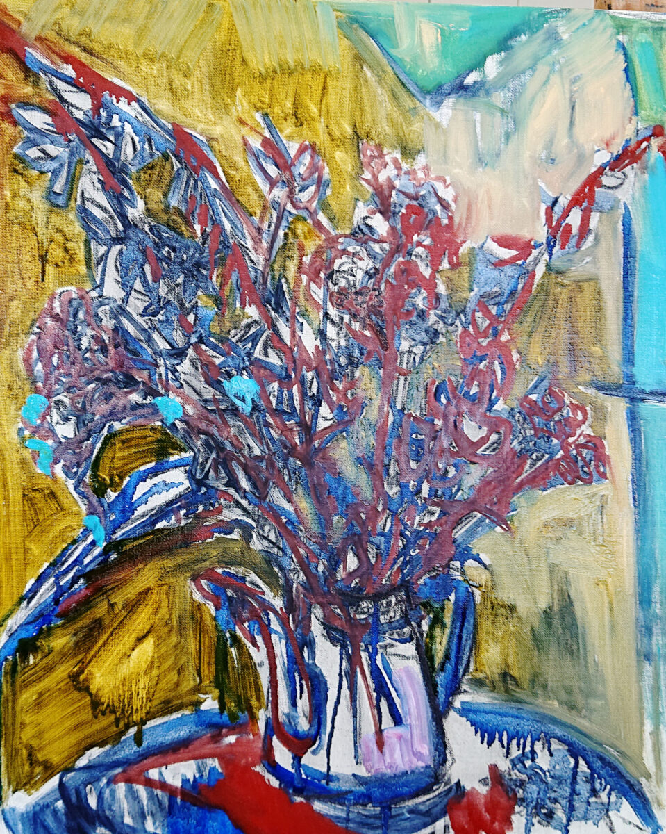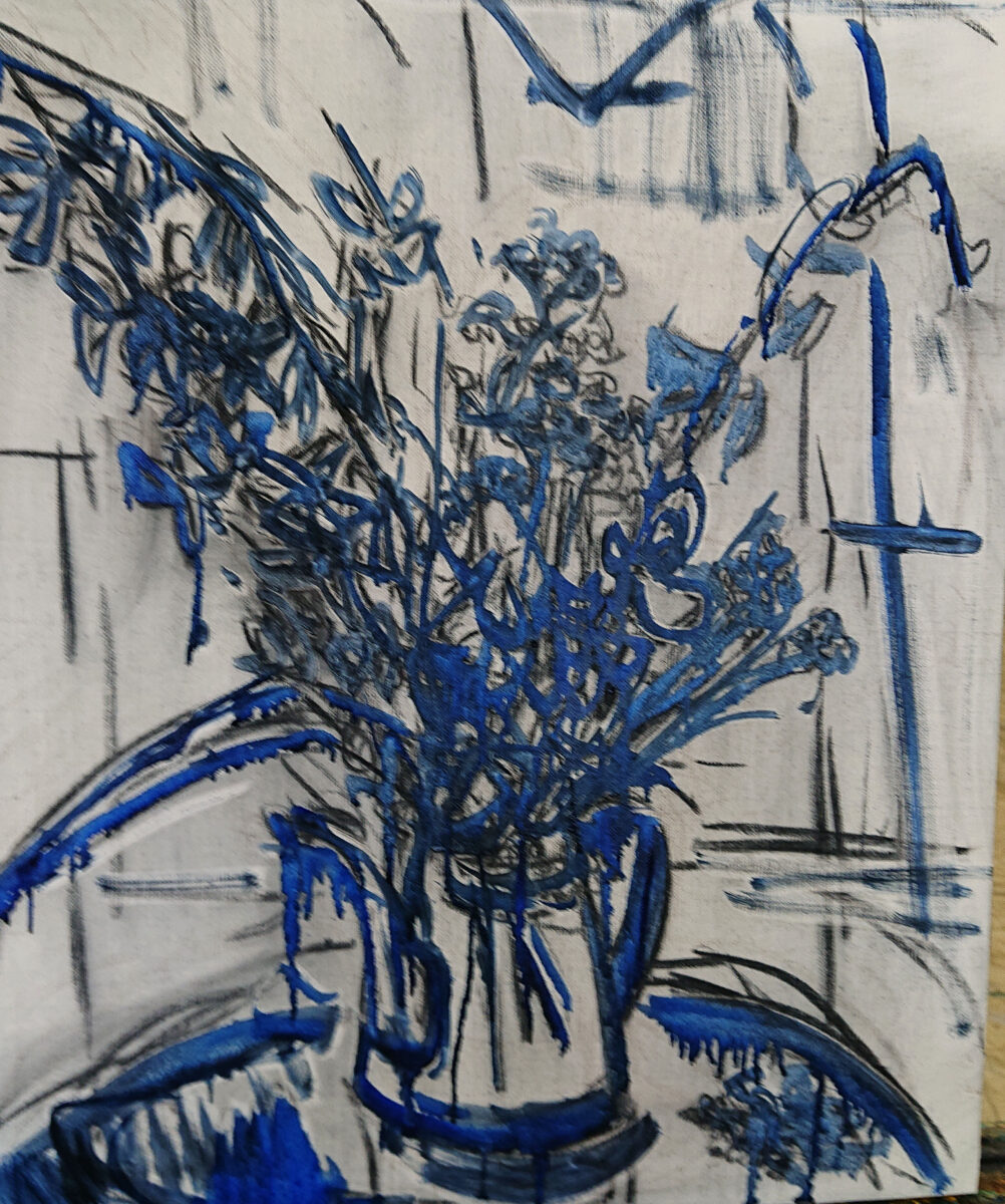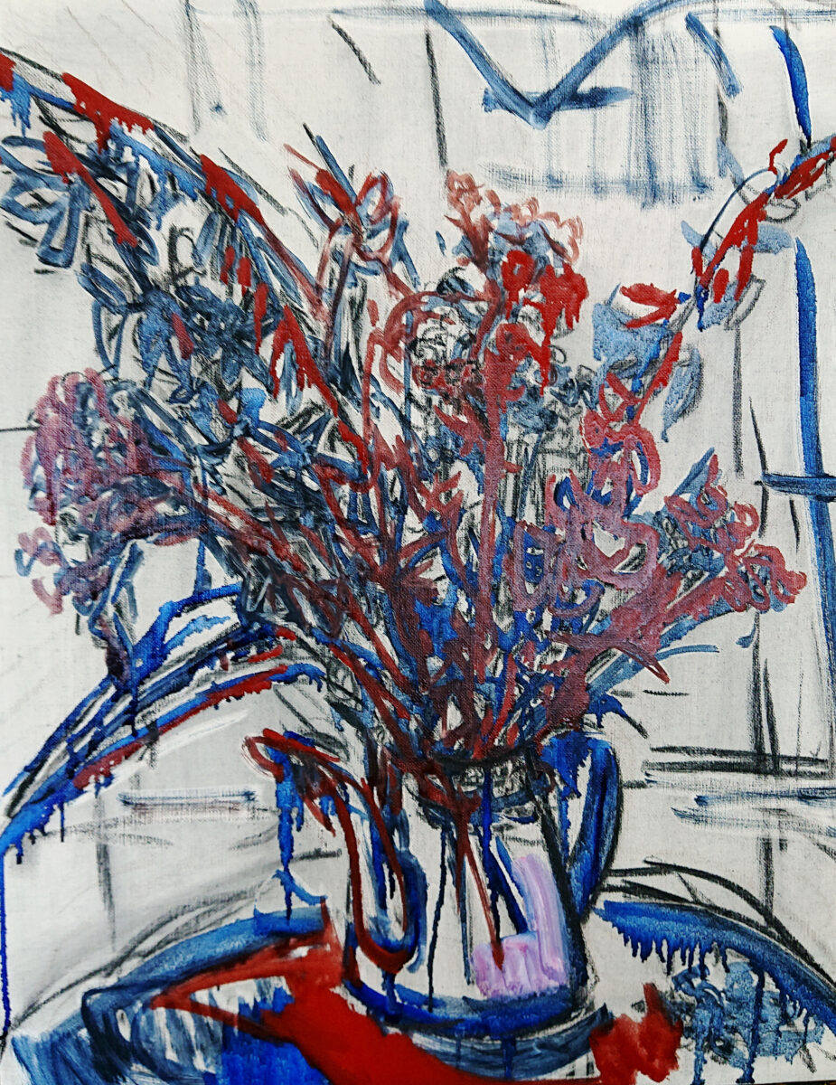 花は赤、葉は緑ですが、それは後から入れるので、今はまず青で描き進めます。