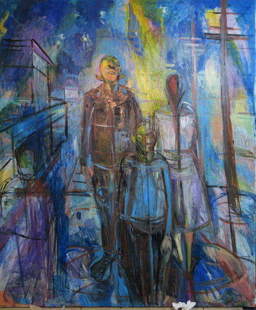 左側の壁と建物は、薄塗で済ませるつもりです。あまり存在感を出すと、真ん中の人物に焦点が当たらないことになります。