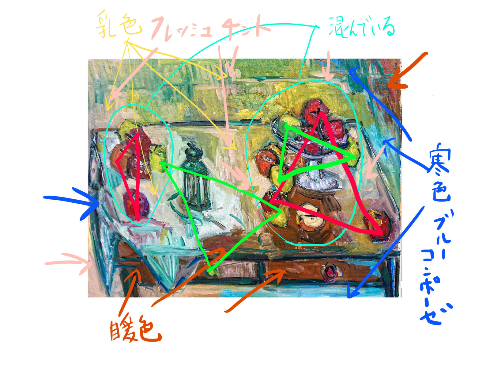 この乳色たちは、補色関係の仲介役として、ギラギラを押さえます。
