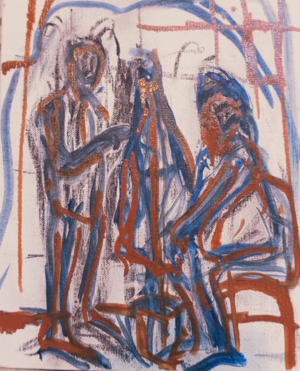 木炭で形をとって、青で整えて、ライトレッドで下描きは完成です。