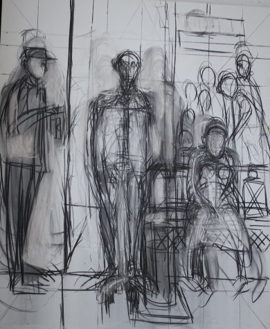 まず、カンバスに線を引きます。半分,またその半分というように、木炭で引いていきます。
